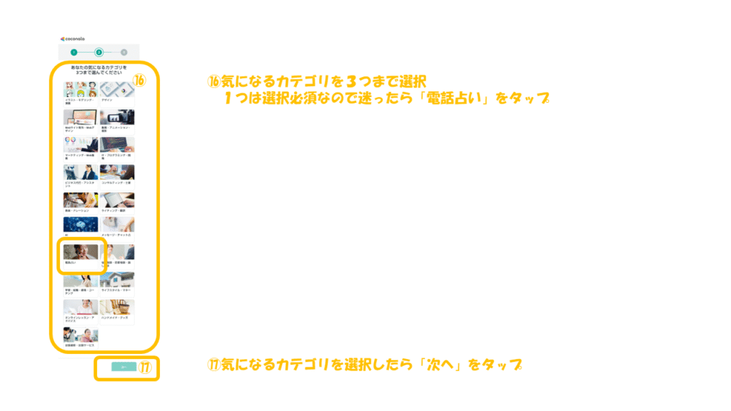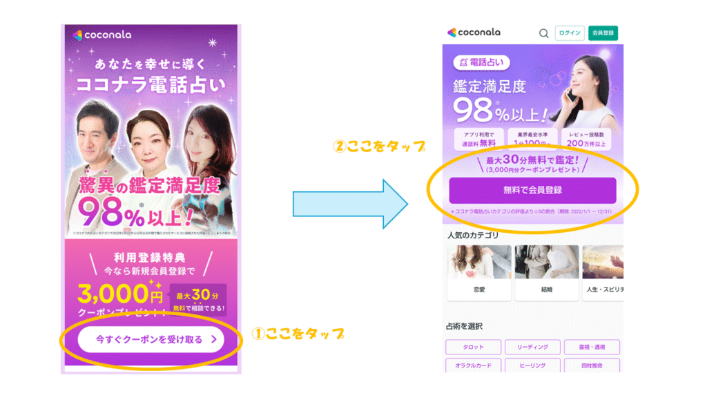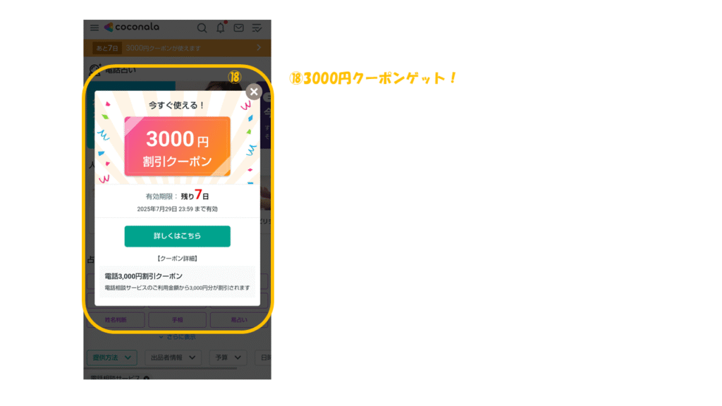 ココナラ電話占いでは、はじめての方限定で“3000円分無料クーポン”が用意されています。
