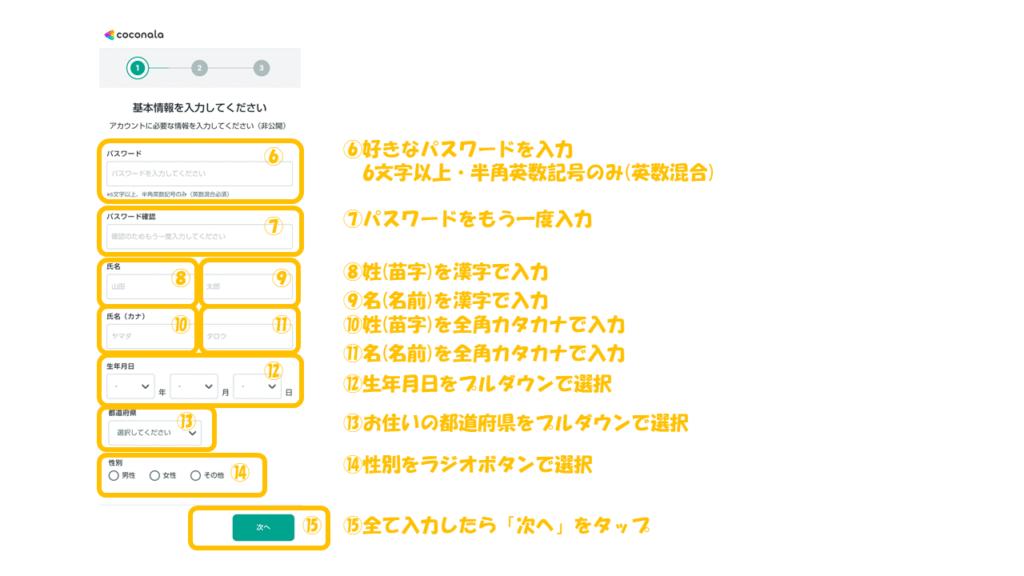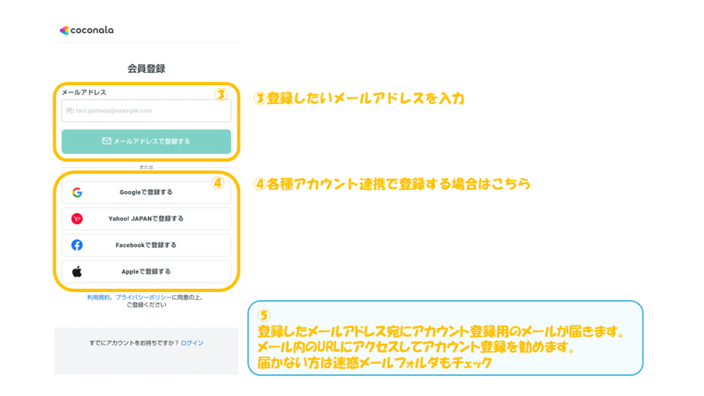 以下の画像の手順で会員登録を進めます。