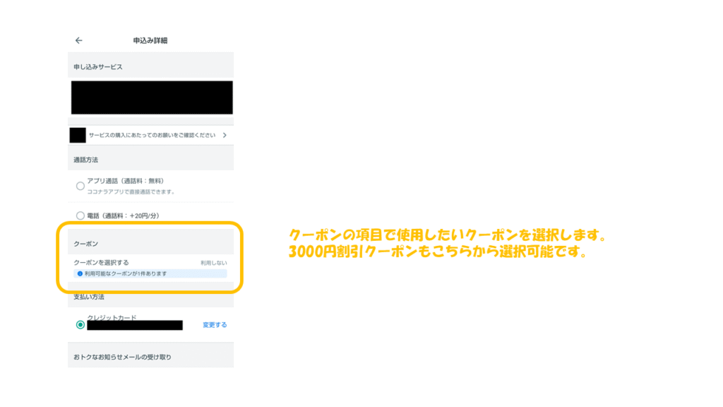 3000円割引クーポンはこちらから選択します。